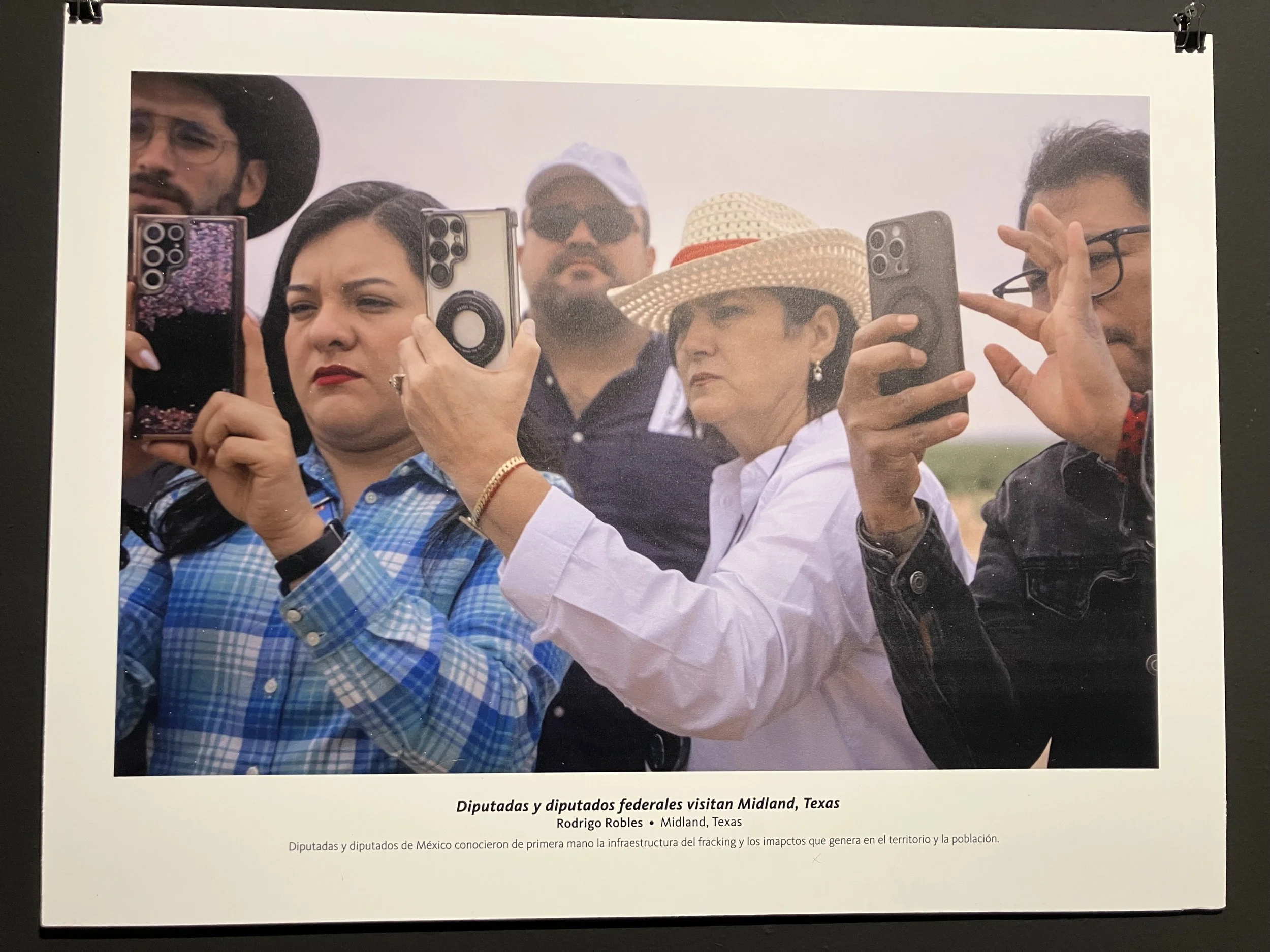 Photo of a photo. A exhibit on fracking inside the General Congress of the United Mexican States in October 2025 included this photo of Mexican legislators visiting the oilfields of the Permian Basin in West Texas during their fact-finding tour in September. Photo credit: Sandra Steingraber