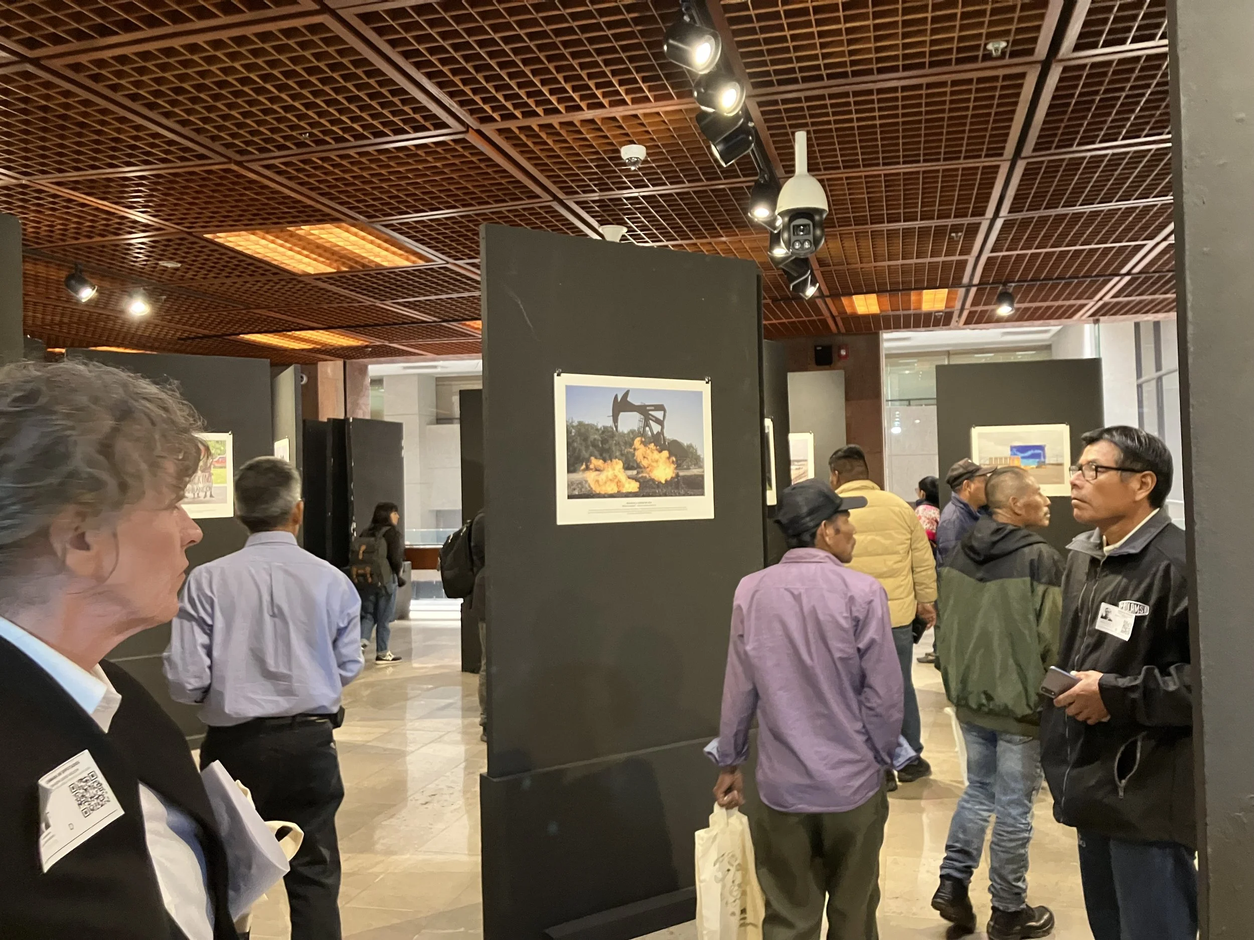 Sharon Wilson of Oilfield Witness looks on as journalists and legislators tour the fracking photography exhibit in the Mexican Congress, October 15, 2025. Photo credit: Sandra Steingraber