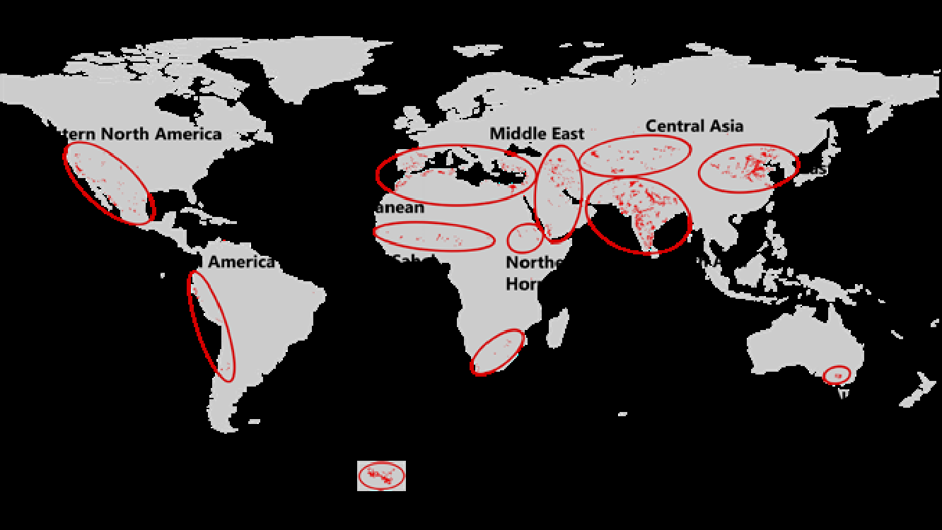 Figure 1: Global water stress hotspots. Hotspot areas are those classified by the Food and Agriculture Organization as water scarce and by World Resources Institute as areas with high, or extremely high, water stress. Source: World Meteorological Organization, 2021 State of Climate Services – Water (Geneva, Switzerland: World Meteorological Organization, 2021), pg. 8.